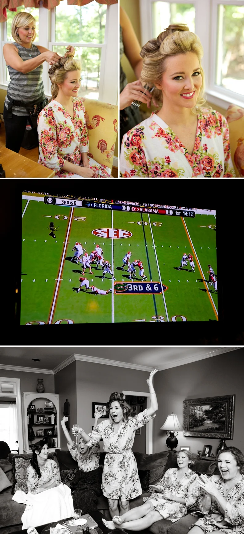 Can you tell we loved this wedding?? I mean come on, you know it is going to be awesome when you walk in to find a bunch of bridesmaids, hair in rollers, champagne flute in hand and cheering on their favorite football team! Kylee and Jay married beneath streamers blowing in the wind. Who doesn't love a groom in a bow tie and bridesmaids in mismatching dresses? We had such a great time capturing this wedding!